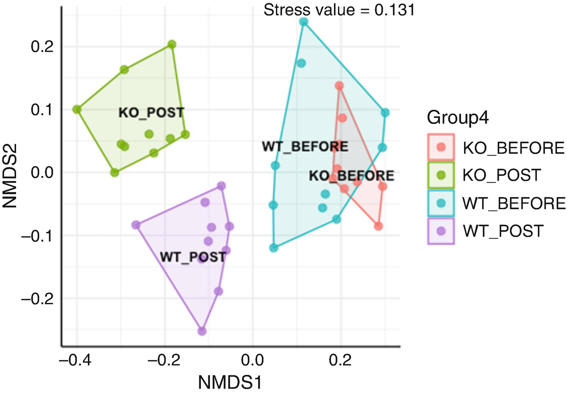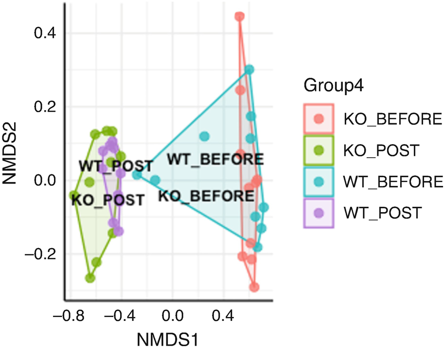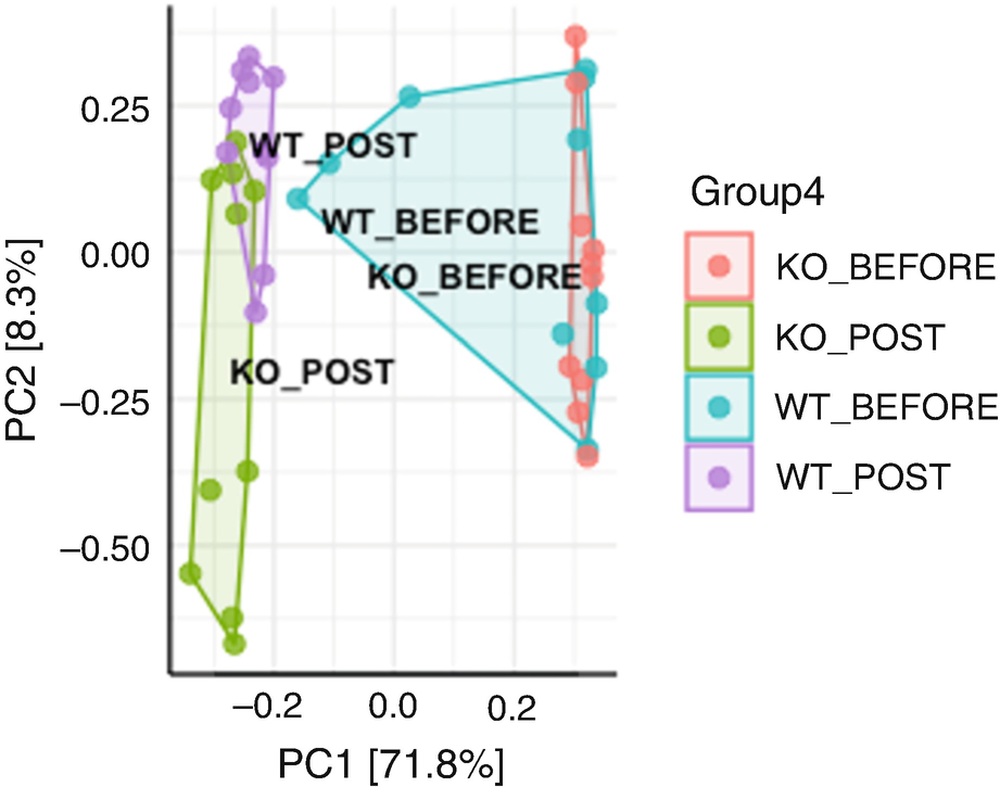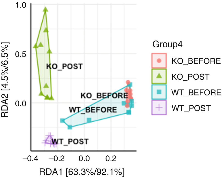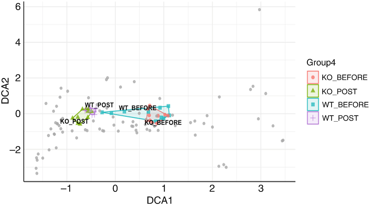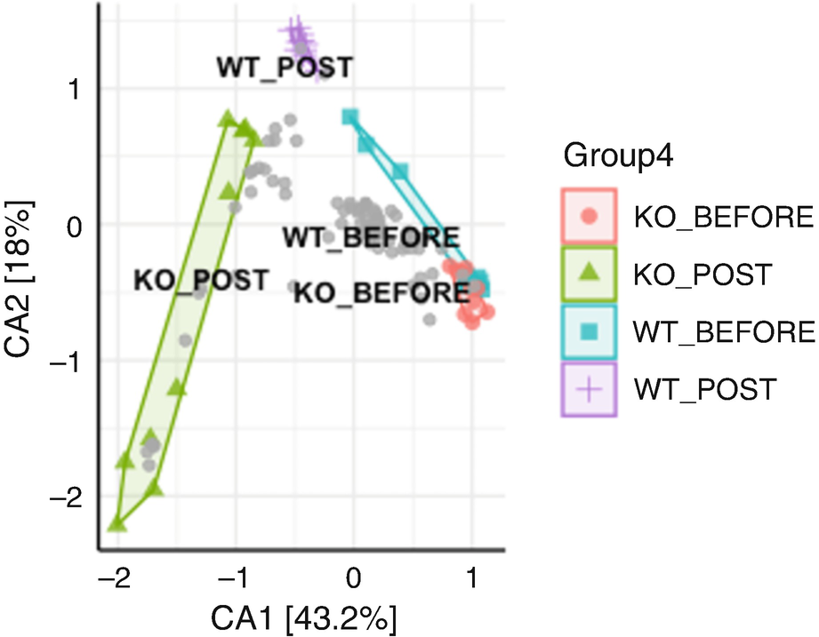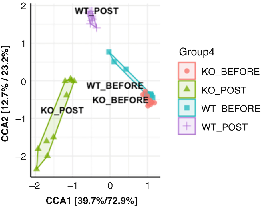 An ordination plot created by the canonical correspondence analysis for Q T R T 1 gene data measures K O before, K O post, W T before, and W T post. The values are grouped together by the lines drawn between them.