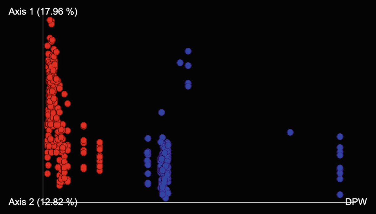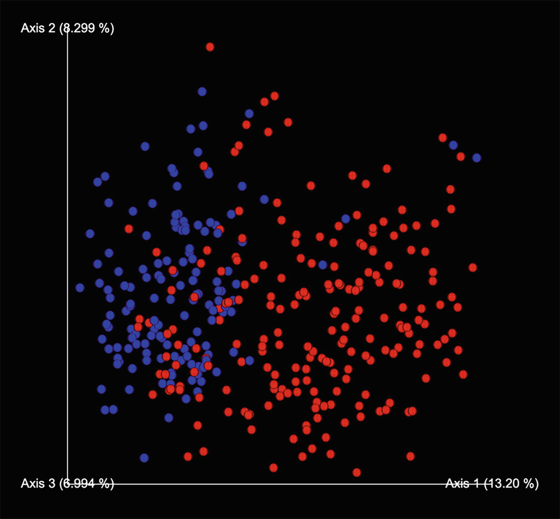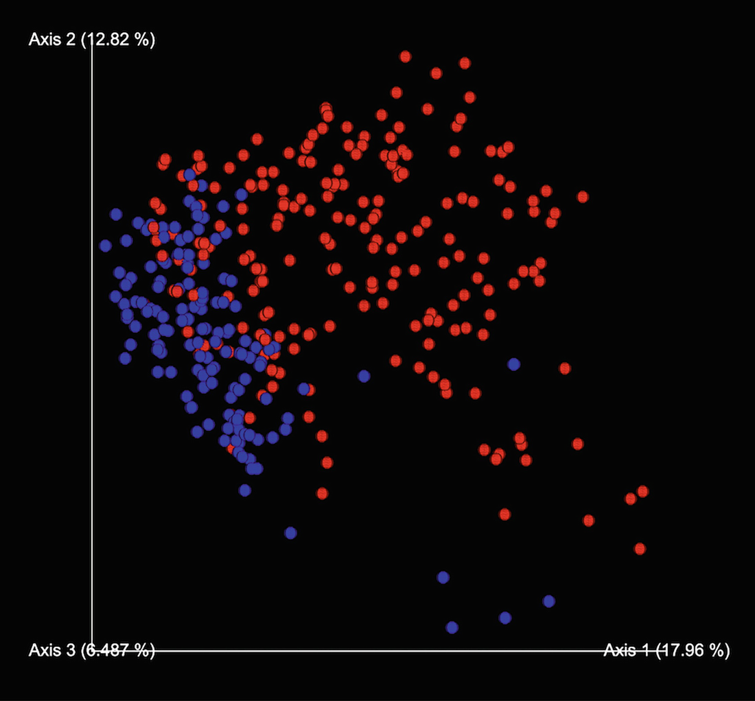 The PCoA plots are automatically generated along with beta diversity measures. These plots display a three-dimensional ordination and can be viewed. Figure 10.16 shows a static example of the interactive principal coordinates visualization of Bray-Curtis distance.