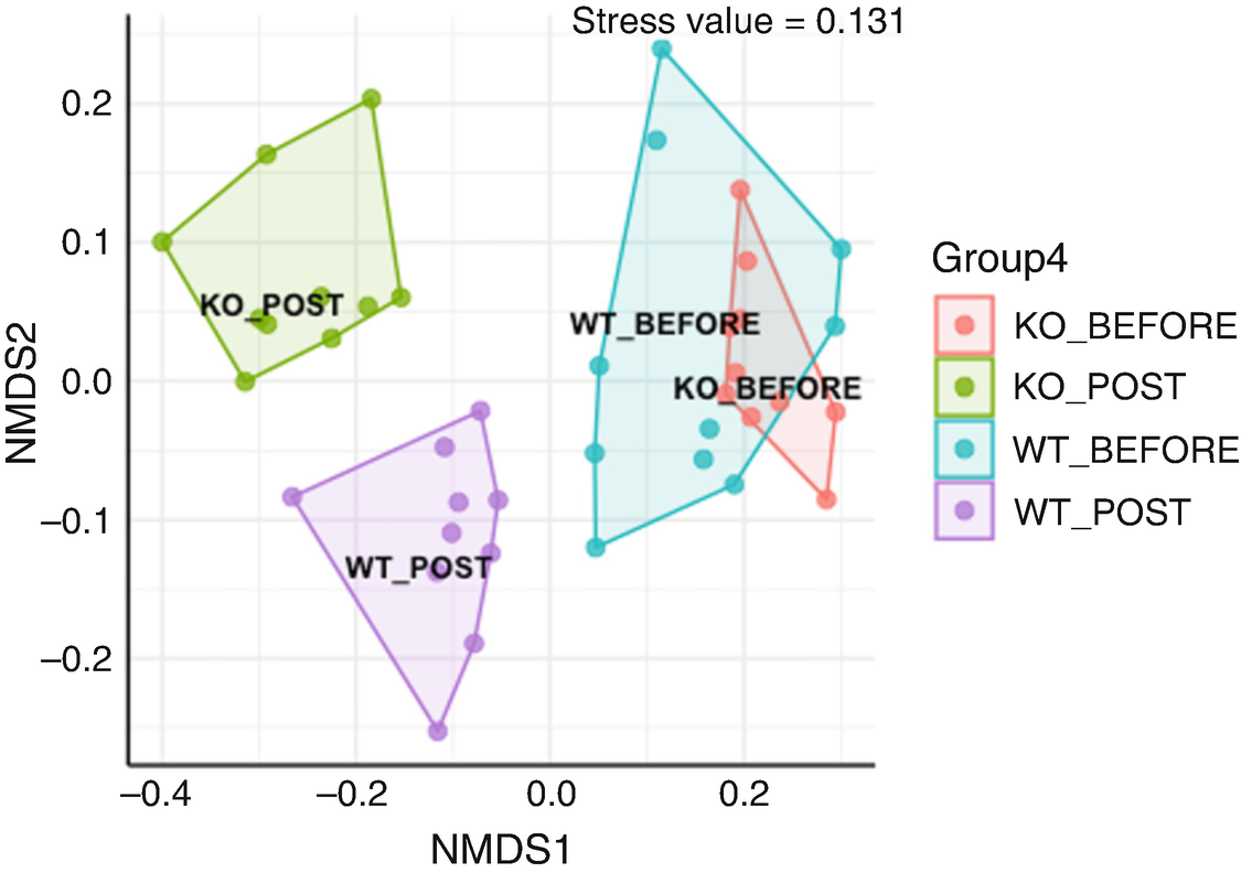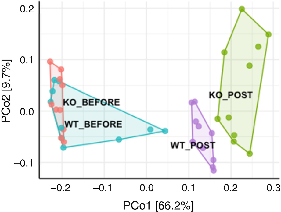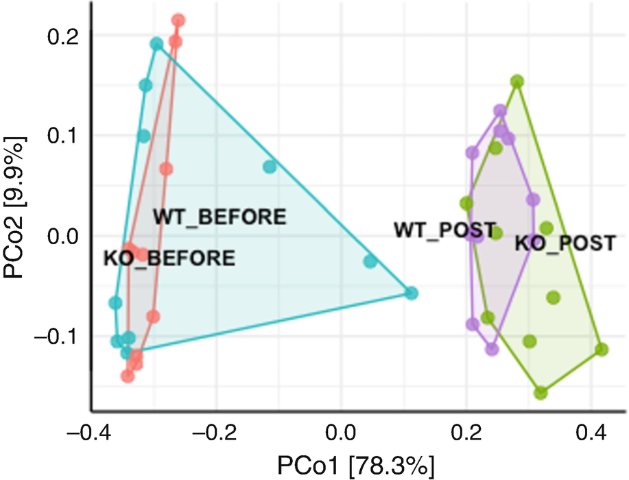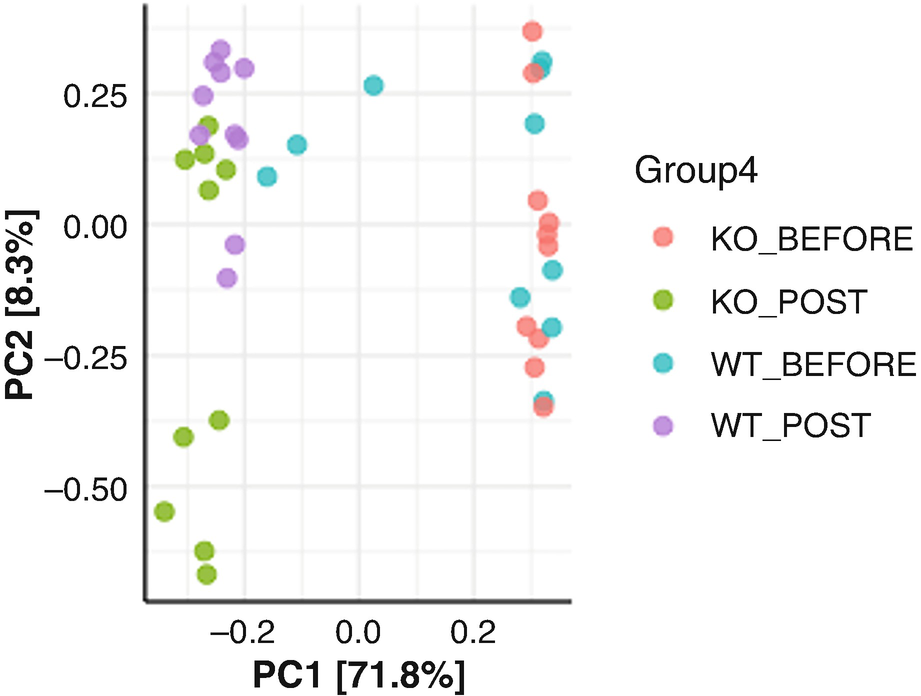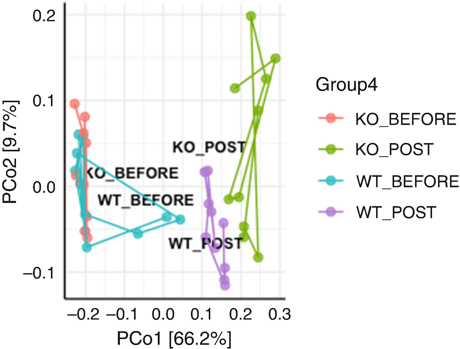 Emperor plots for unweighted UniFrac distance in mouse gut microbiome samples
