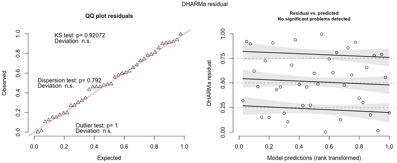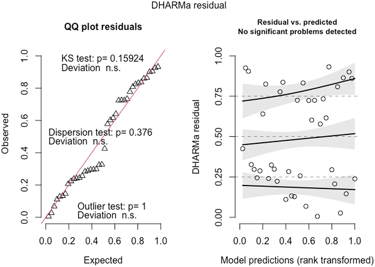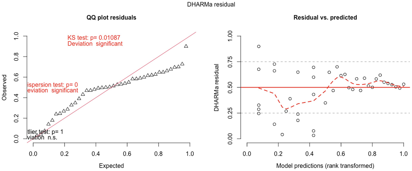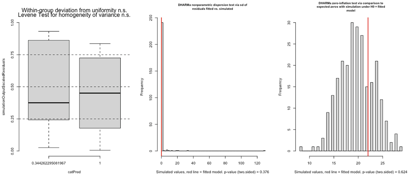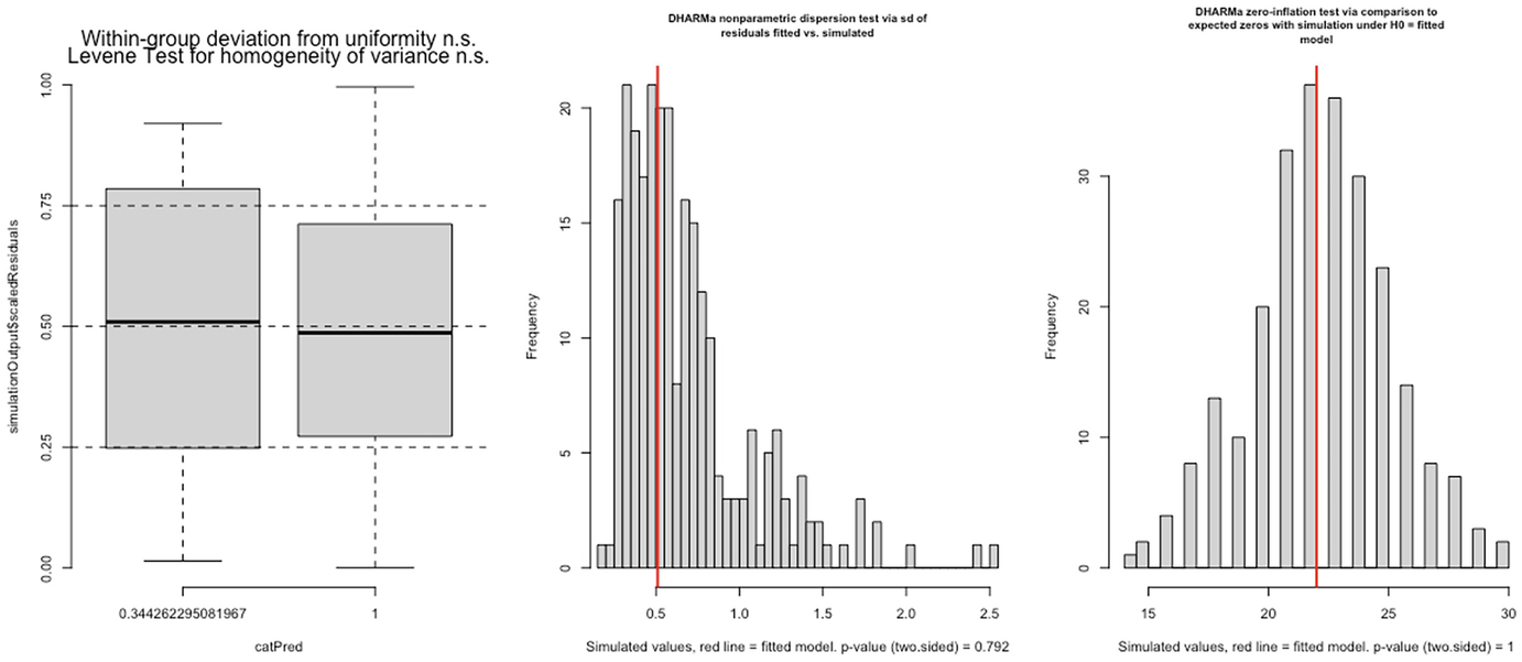 We diagnose the model fits from glmmTMB, GLMMadaptive through the DHARMa package, which takes the approach of simulating, scaling, and plotting residuals. The readers can use this approach as a reference, but model evaluation should not fully be determined based on its results because the simulation approach itself still need to be further validated.
