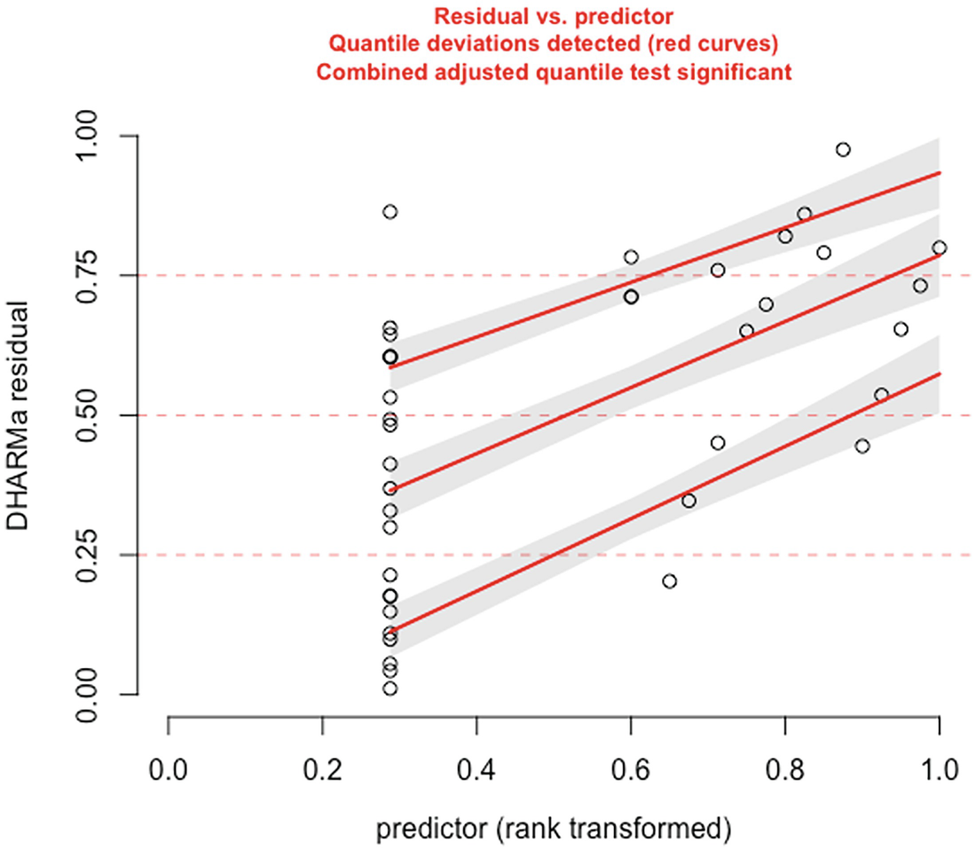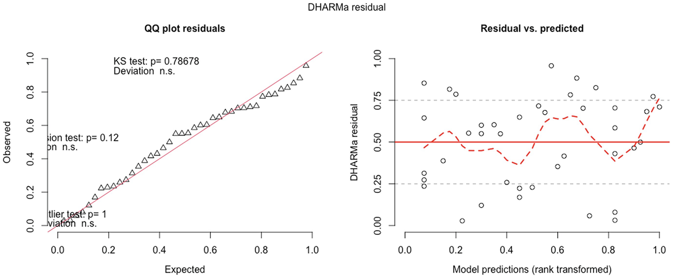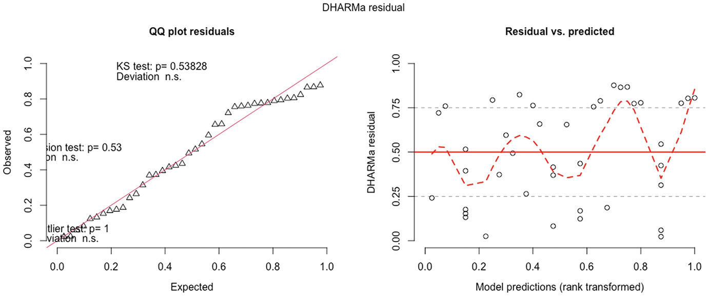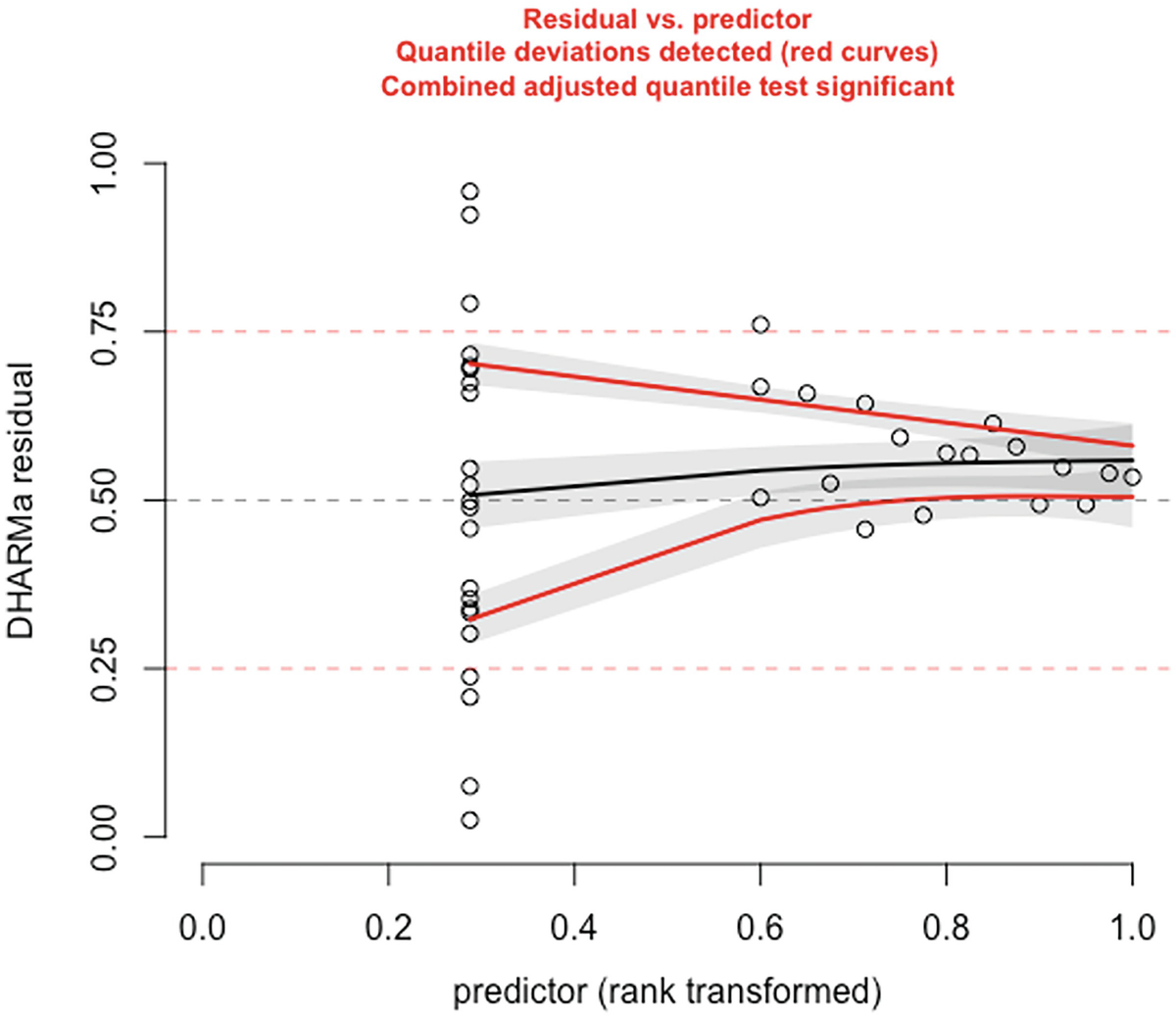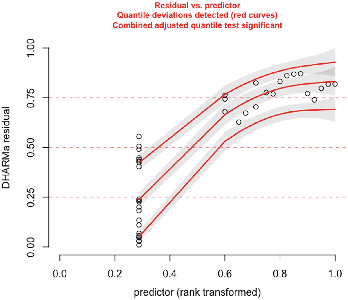 We diagnose the model fits from glmmTMB, GLMMadaptive through the DHARMa package, which takes the approach of simulating, scaling, and plotting residuals. The readers can use this approach as a reference, but model evaluation should not fully be determined based on its results because the simulation approach itself still need to be further validated.