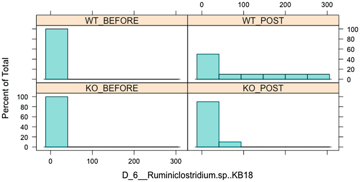 Histogram of Ruminiclostridium.sp.KB18 over before and posttreatment in wild-type (WT) and knockout (KO) groups