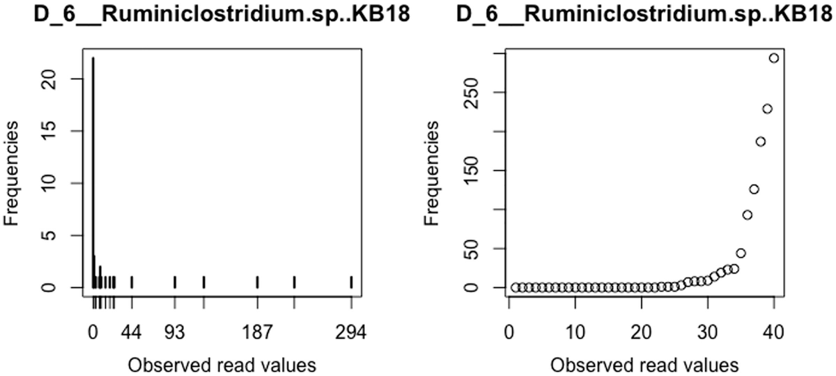 A graph and a scatterplot of D underscore 6 underscore Ruminiclostridium dot s p, K B 18 plots frequencies versus observed read values. The graph displays a decreasing trend and the scatterplot has an increasing trend.