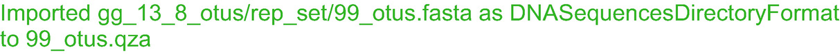 A color gradient file name reads, imported g g underscore 13 underscore 8 underscore otus slash r e p underscore set slash 99 underscore otus dot fast a as D N A sequences directory format to 99 underscore otus dot q z a.