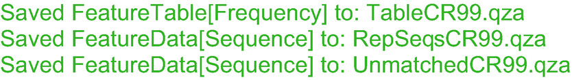 After implementing closed-reference clustering, we obtain a FeatureTable[Frequency] artifact (TableCR99.qza) and a FeatureData[Sequence] artifact(RepSeqsCR99.qza). Note that The FeatureData[Sequence] artifact (in this case RepSeqsCR99.qza or UnmatchedCR99.qza) is not the sequences defining the features in the FeatureTable, but rather the collection of feature ids and their sequences that didn’t match the reference database at 99% identity.