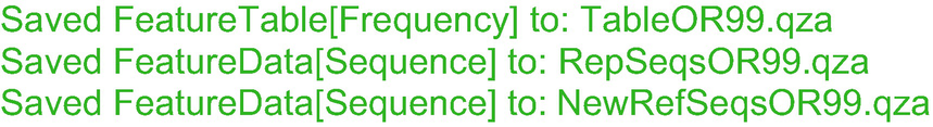 Open-reference clustering generated a FeatureTable[Frequency] artifact TableOR99.qza, and two FeatureData[Sequence] artifacts: RepSeqsOR99.qza and NewRefSeqsOR99.qza. The first FeatureData[Sequence] artifact represents the clustered sequences, while the second artifact represents the new reference sequences, composed of the reference sequences used for input, and the sequences clustered as part of the internal de novo clustering step.