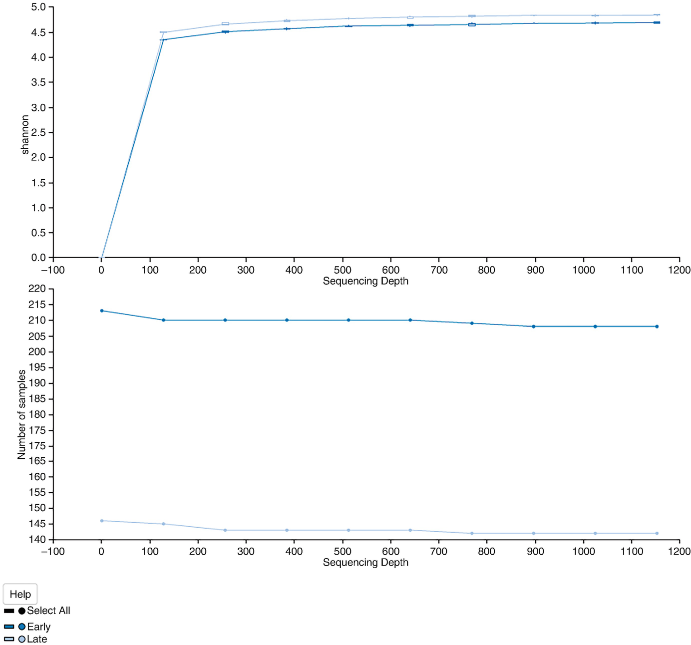 Two patterns were noticed from this alpha rarefaction curve: One is that both early and late time points appear to plateau. The Shannon diversity measure does generally continue to increase as a function of the sequencing depth; however, the accumulation increases slowly, suggesting that we have sufficient sample sequence depth to have captured the majority of taxa present in the sample. Another pattern we can see from this plotting is that the late samples have a significantly higher Shannon diversity than the early time. This result is consistent with the Kruskal-Wallis test in Sect. 9.5.4.