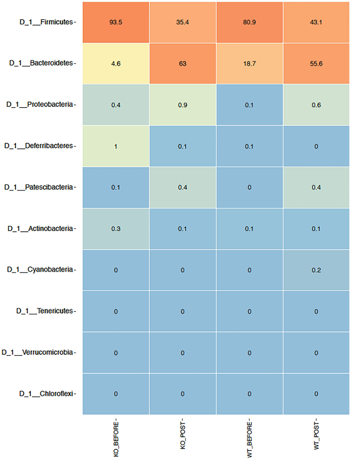 Sun and her team in 2020 conducted a murine microbiome experiment to explore whether and how the enzyme queuosine (Q)-tRNA ribosyltransferase catalytic subunit 1 (QTRT1) affects tumorigenesis and the microbiome. Queuosine is a micronutrient from diet and microbiome. Transfer RNA (tRNA) Q-modifications occur specifically in four cellular tRNAs at the wobble anticodon position. Because the microbiome product queuine is required for its installation, so tRNA Q-modification in human cells depends on the gut microbiome. This study aims to (1) examine microbiome-dependent Q-tRNA modification and its impact on breast tumor growth and gene expression and (2) identify the mechanisms of tRNA Q-modification-dependent cellular phenotypes in vitro and in vivo. Single clones of complete QTRT1-knockout (KO) in human breast cancer MCF7 cells were generated. The Q-modification levels of the MCF7 wild-type (WT) and QTRT1-KO cells were measured using the standard APB gel method. In this study, 20 KO mice (n = 10 for each of before and post treatments) and 20 WT mice (n = 10 for each of before and post treatments) were investigated. DNA was extracted from fecal samples, and 16S rRNA gene V3–V4 variable regions were barcoded and sequenced using MiSeq according to the Illumina protocol. After DNA sequencing, all possible raw paired-end reads were evaluated and merged using the PEAR (Zhang et al. 2014). Quality-filtered sequences were performed using QIIME pipeline (Caporaso et al. 2010) at a 97% similarity threshold utilizing the USEARCH algorithm (Edgar 2010) and the reference database silva_132_16S.97 (Glöckner et al. 2017). The microbiome data for downstream analysis include a total of 40 samples across 20 mice, resulting in 635 unique OTUs/taxa. The OTUs ranged from 39,813 to 65,762 for the individual sample, with a mean of 55,502.7 and median of 56, 093 and total reads of 2,220,108.