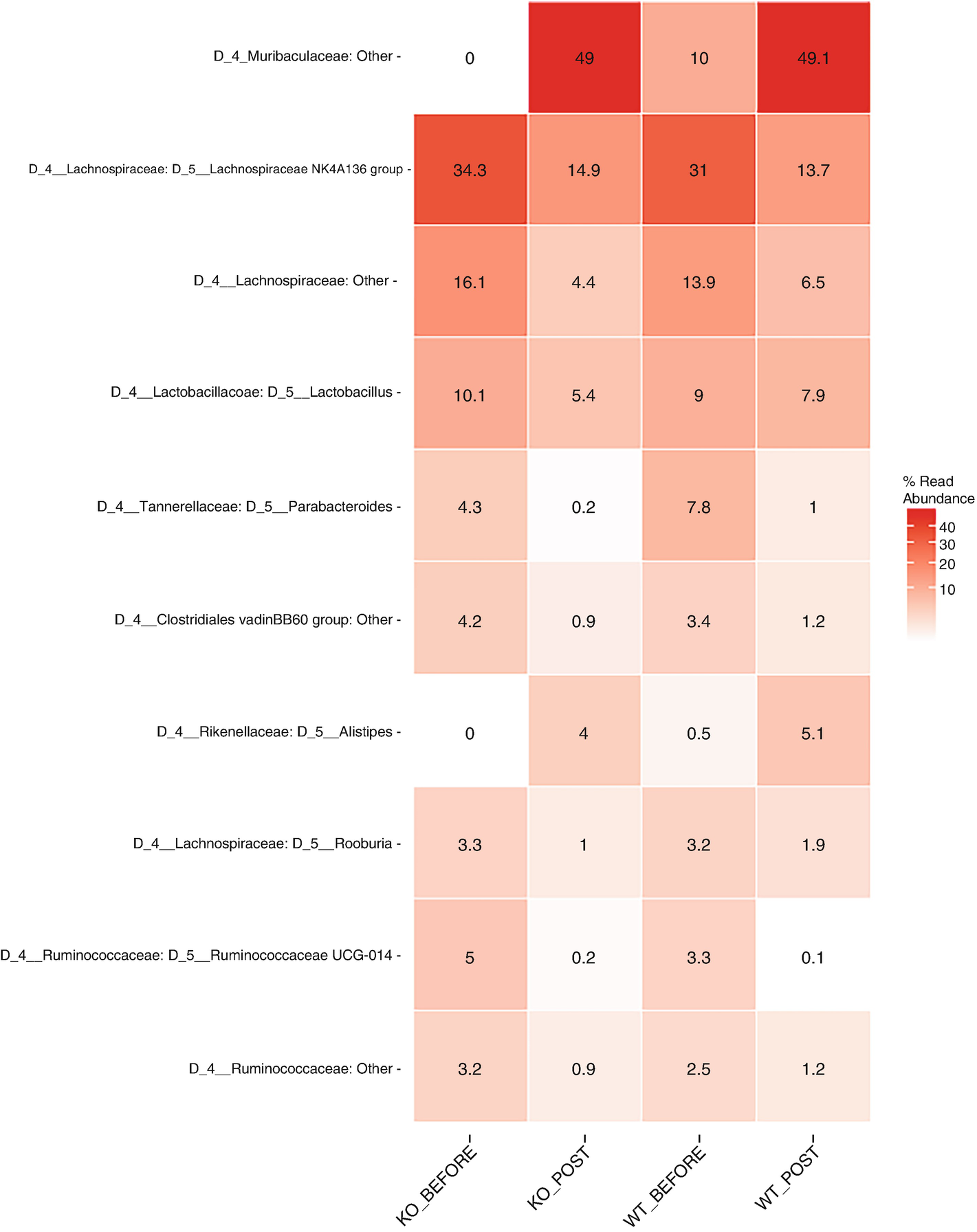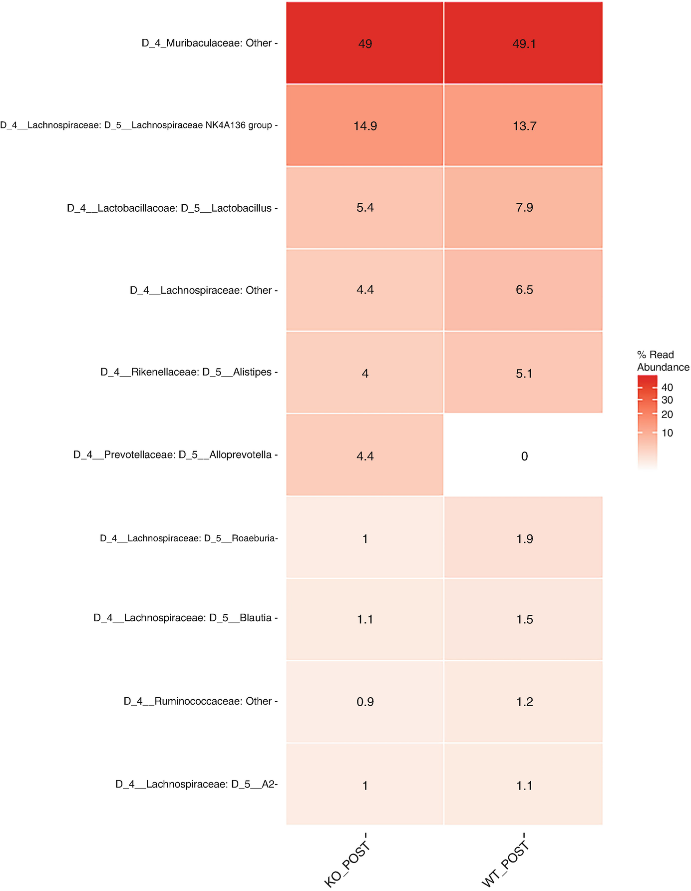 Heatmap of QTRT1 data for post treatments aggregating to genus level with the top 10 genus, ordered by mean read abundance across all samples