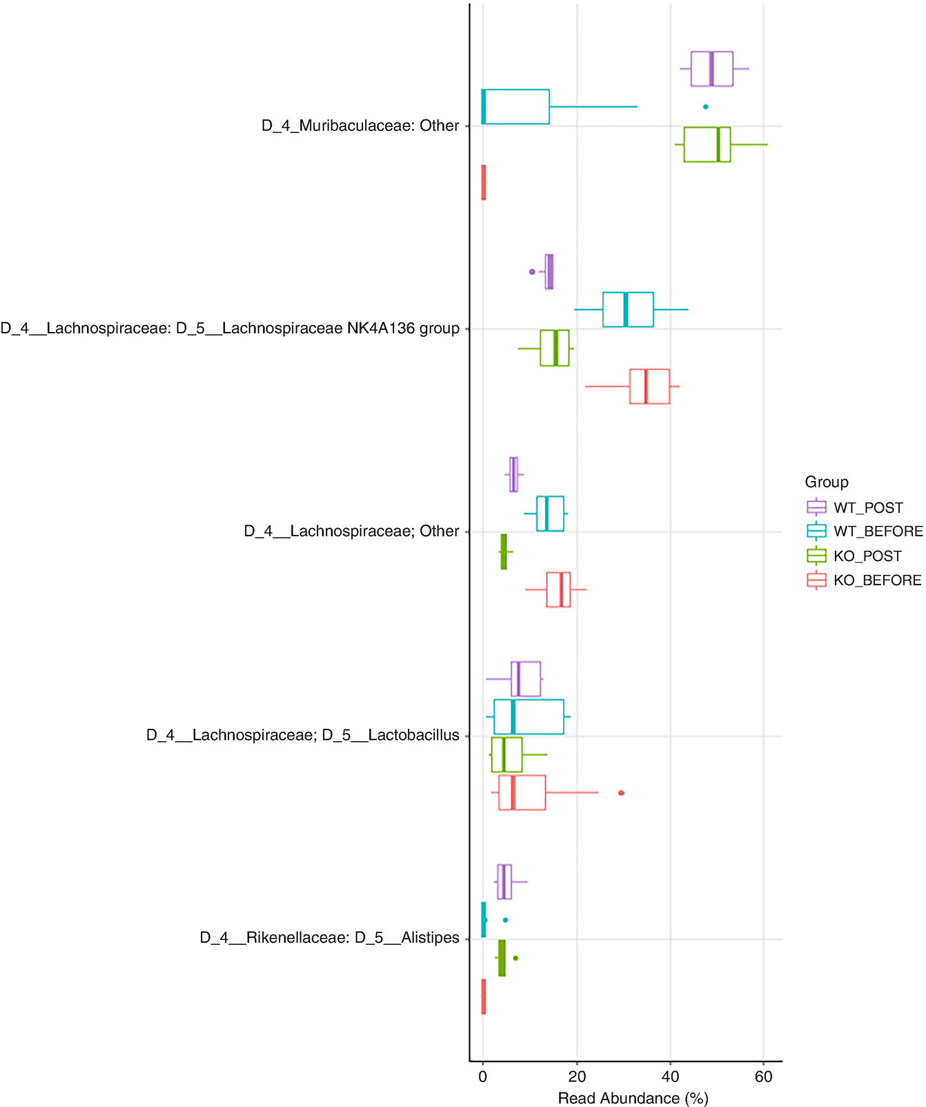 A boxplot of 5 different taxa versus real abundance in percentage. It displays data for the W T post and before and the K O post and before. W T post and K O post values are higher in Muribaculaeceae.