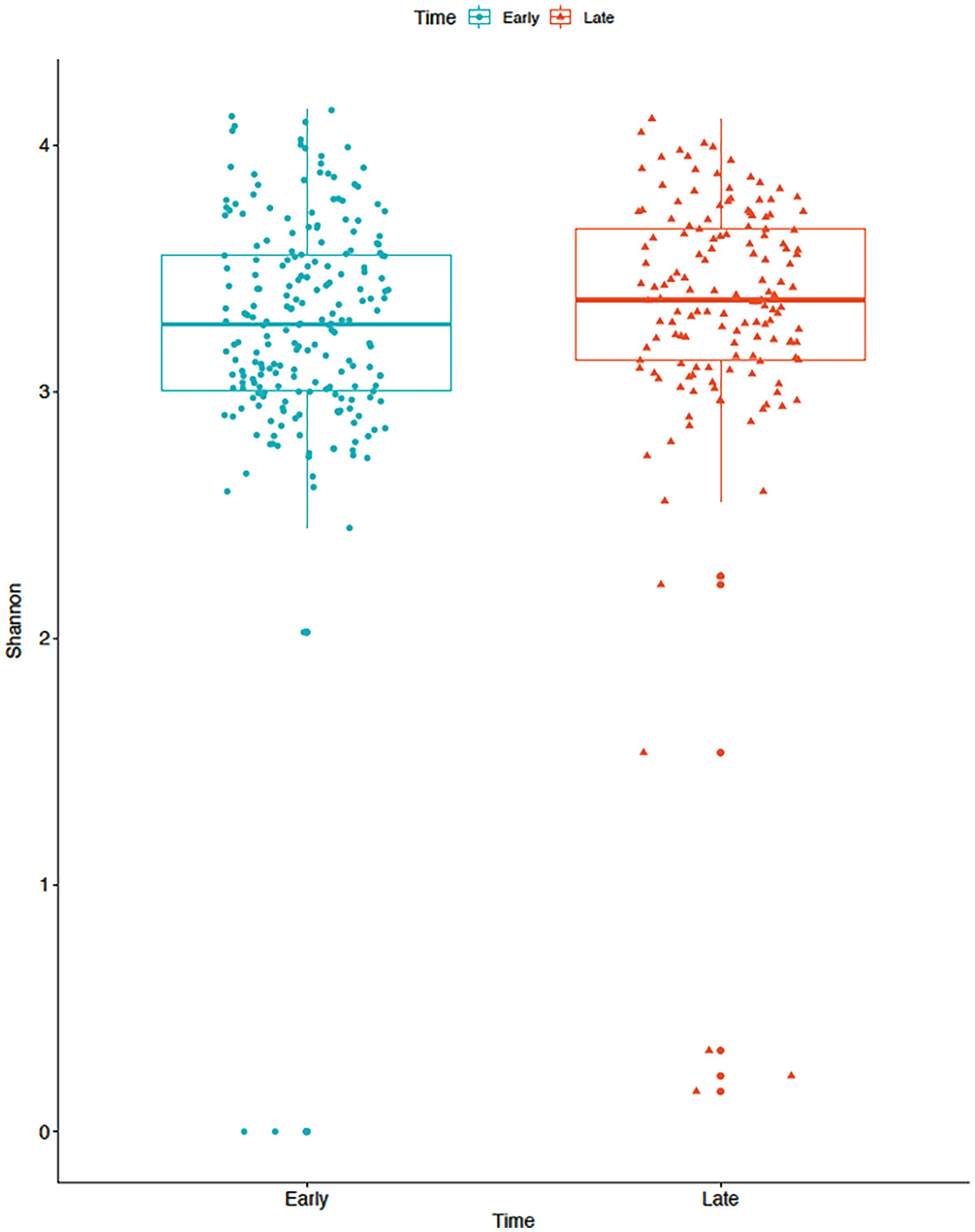 A boxplot of Shannon diversity of the gut microbiome measures the values at early and late time points as depicted by blue and red color boxplots. The values at the late time point are higher than at the early time point.
