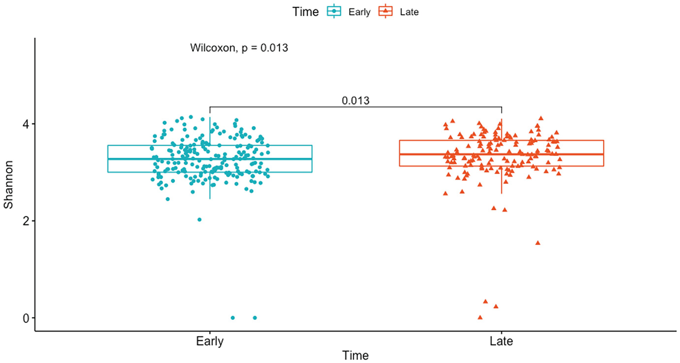 A boxplot represents Shannon diversity of the gut microbiome by p-values obtained at early and late time points of the Wilcoxon rank sum test. The p-value difference between the time points is 0.013 units.