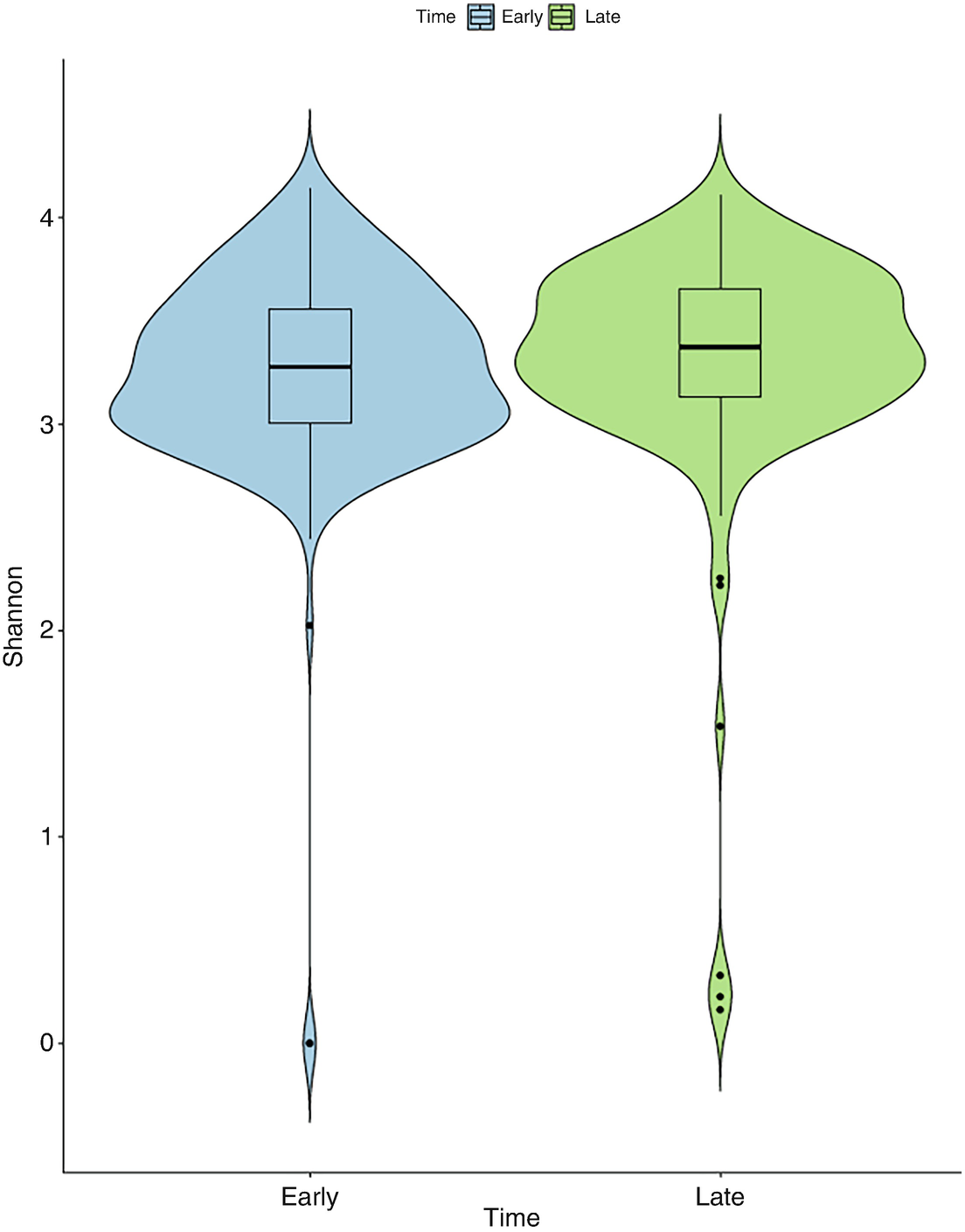 A violin plot of Shannon diversity of the gut microbiome measures the values at early and late time points as depicted by blue and green violin structures. The values at the late time point are broader than at the early time point.