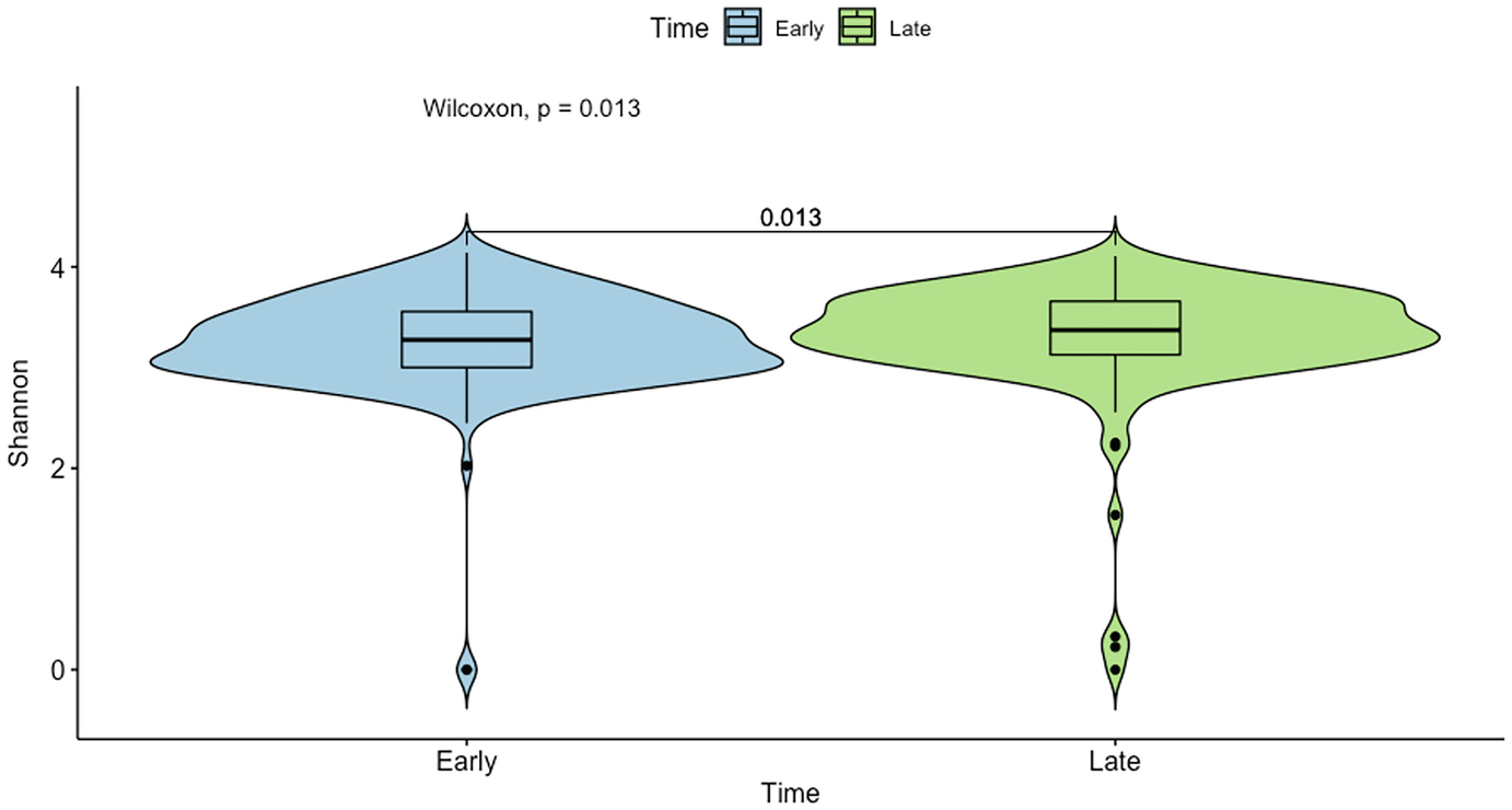 A violin plot of Shannon diversity of the gut microbiome measures the values at early and late time points as depicted by blue and green violin structures. The p-value difference between the time points is 0.013 units as measured by Wilcoxon sum test.