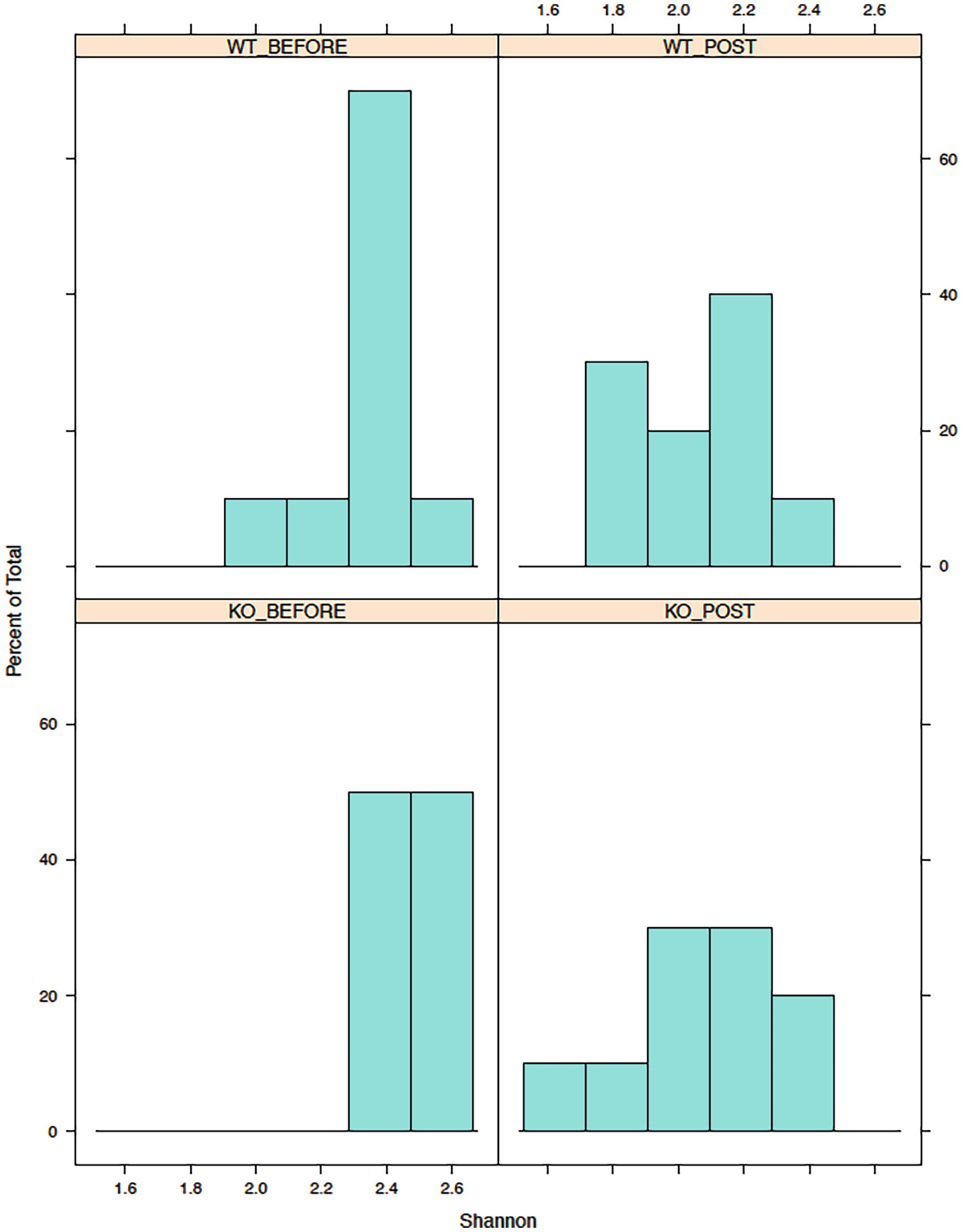 A histogram of the percent of total versus Shannon has 4 parts, W T before, W T post, K O before, and K O post. It displays that the highest values occur before the W T and K O parts.