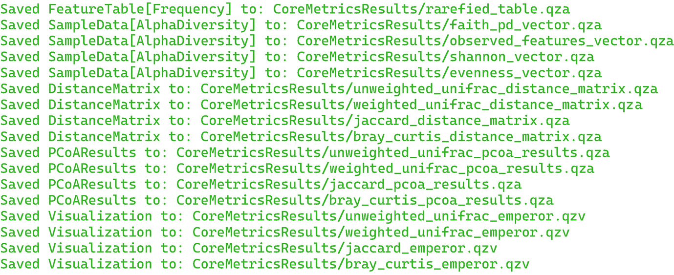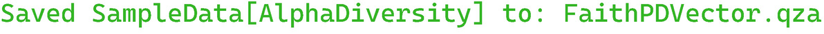 A text reads, saved sample data, open bracket, Alpha diversity, closed bracket, to, F a i t h P D V e c t o r dot q z a.