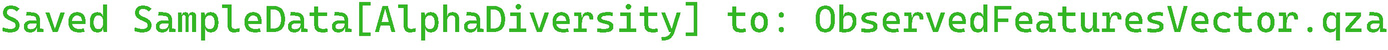 A text reads, saved sample data, open bracket, Alpha diversity, closed bracket, to, O b s e r v e d f e a t u r e s v e c t o r dot q z a.